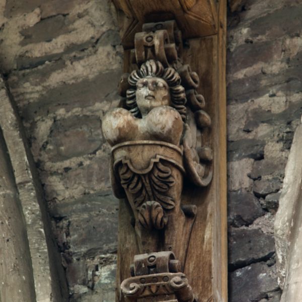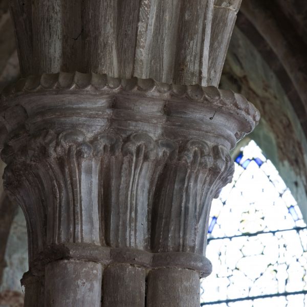 Note the carved stone bosses, rescued from the original roof; the capitals, medieval glass and tiles, wall paintings and texts, fine wood work by John Abel and the original stone altar.