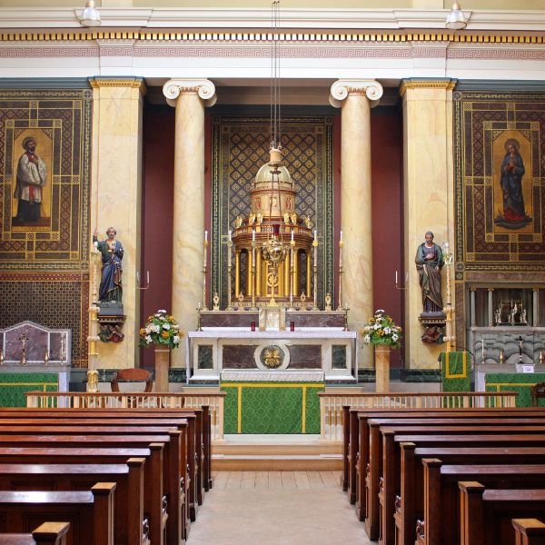 The sanctuary includes a high altar and a tabernacle which is an exact replica of the Chapel of the Blessed Sacrament of St Peter’s in Rome. To the right of the tabernacle is the reliquary of the hand of martyr Father John Kemble, hanged in Widemarsh Common in 1679 for practicing his faith as a Roman Catholic priest at the age of 79 years.