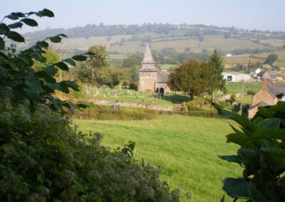 A picturesque church in an idyllic rural setting. Dating in part from the 12th century, an extensive Victorian restoration removed many of the medieval features but a fine vaulted ceiling with carved bosses remains. The structure features an attractive 16th century timber bell tower topped by a squat steeple. To celebrate the millenium, a stained glass east window of contemporary design was installed, based on the theme of “light”