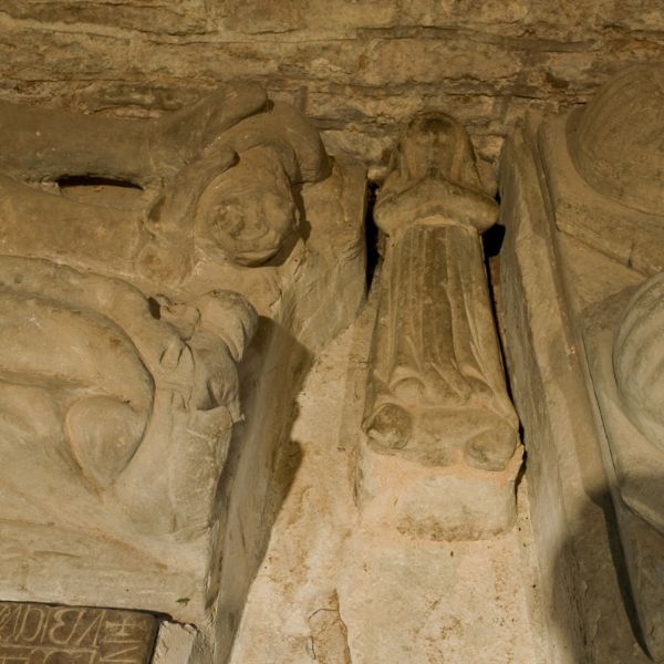 In the Tower base can be seen a remarkable group of medieval effigies together with a flat slab bearing the figure of a lady identified as Maud de Edefen all of which commemorate the Edefen family.
