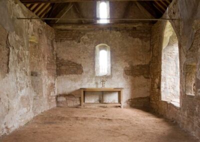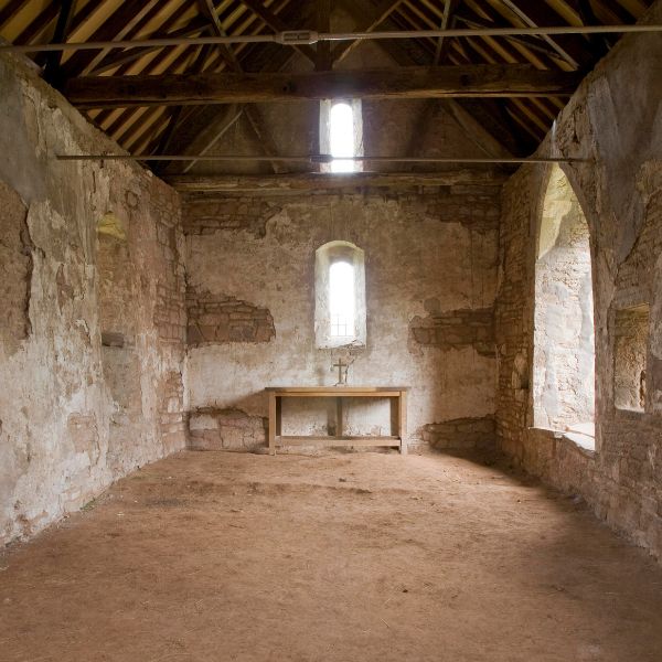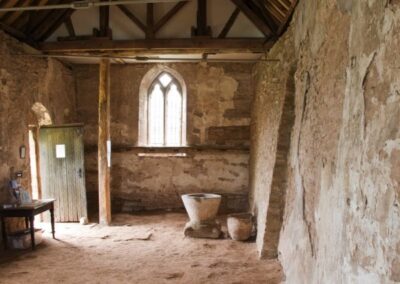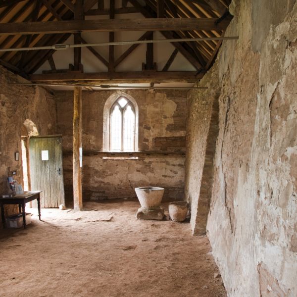 The simplicity of this tiny church and its farmyard setting convey a strong sense of the remote and the romantic. This is reinforced by the 12th century tympanum over the south door and the gradually eroding shafts below, together with the agricultural floor and the largely unplastered walls. Of the two fonts only the more damaged one is original to the church – the other one came from the disused church of Brobury (now a private house).Remains of the screen have been reassembled in Yatton’s ‘new’ church, some ½ mile to the east.